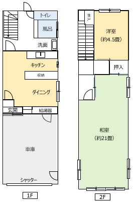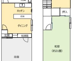 間取り | 1階:ダイニングキッチン、風呂、トイレ 2階:和室21畳、洋室4.5畳 |