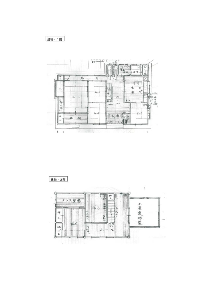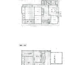 | 間取り | 1階 居間6畳、台所、風呂、トイレ、和室12畳、和室6畳、和室6畳 2階 トイレ、その他(納戸)8畳、洋室6畳、洋室6畳 |